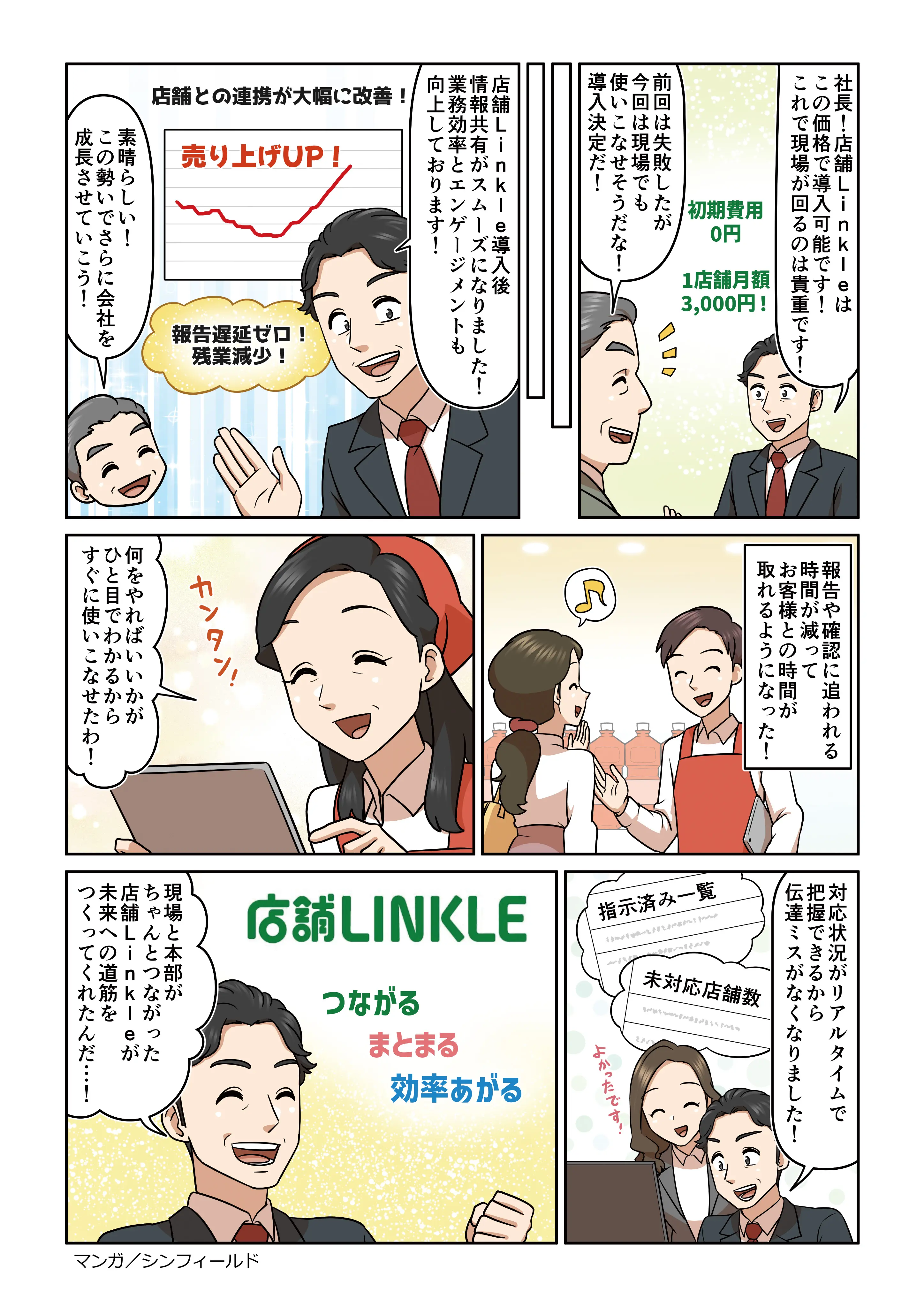 本部からの指示、店舗間の繋がり、現場の声の吸い上げ、SVとの相談など。「今日やることは何か」、「新しい情報は何か」が簡単な操作で必要な情報だけ効率的に共有することができます。